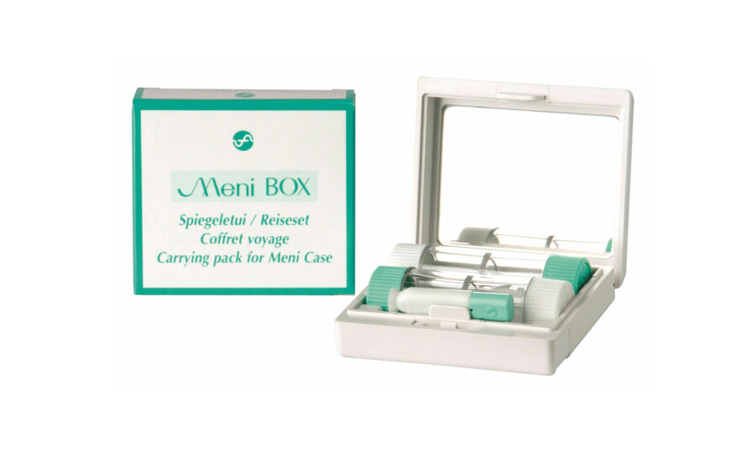 Die Meni Box enthält zwei Meni Case Behälter zur Aufbewahrung von formstabilen Kontaktlinsen, einen integrierten Spiegel und einen Kontaktlinsensauger.